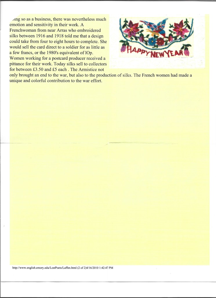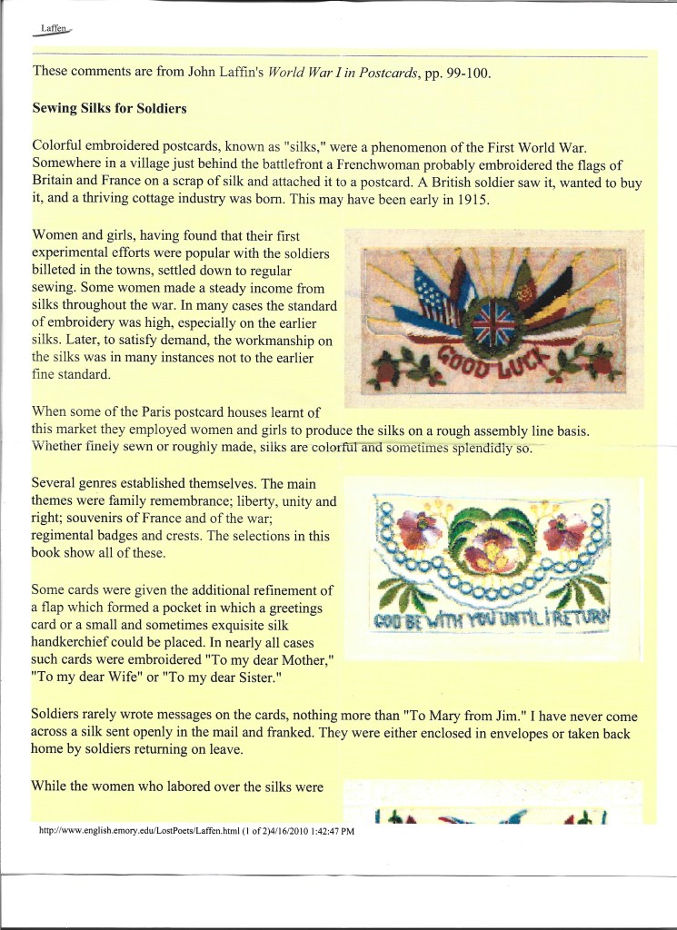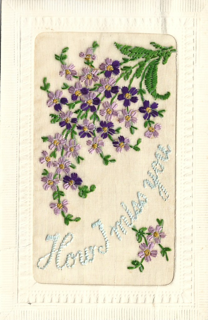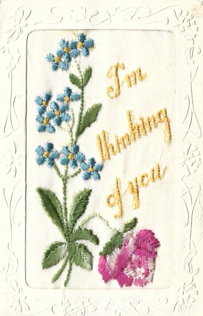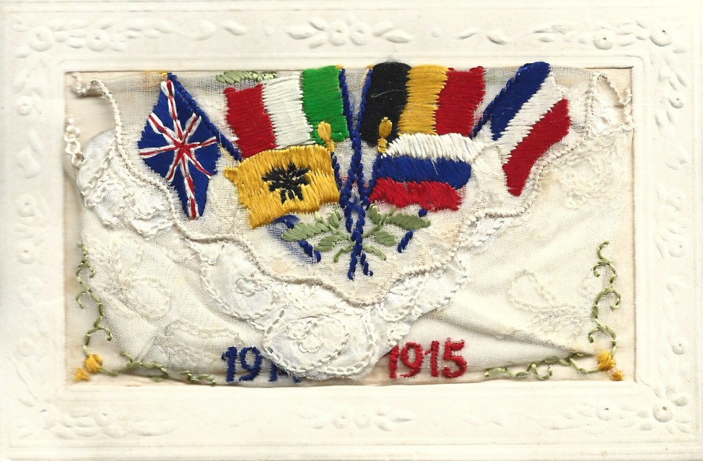 A collection of postcards that were sent by soldiers at the front of WW1 to family and loved ones back home. They gave no hint of the horrors they were experiencing. They were made by the women & girls of France and Belgium and sold to the troops on leave for a few francs or guilders.