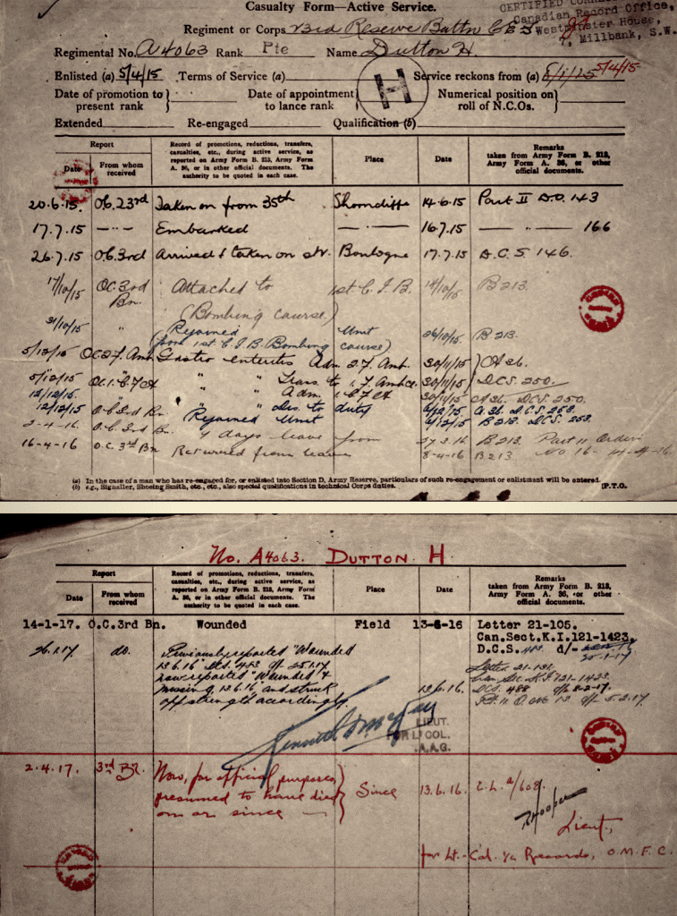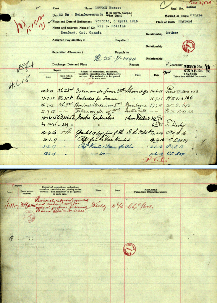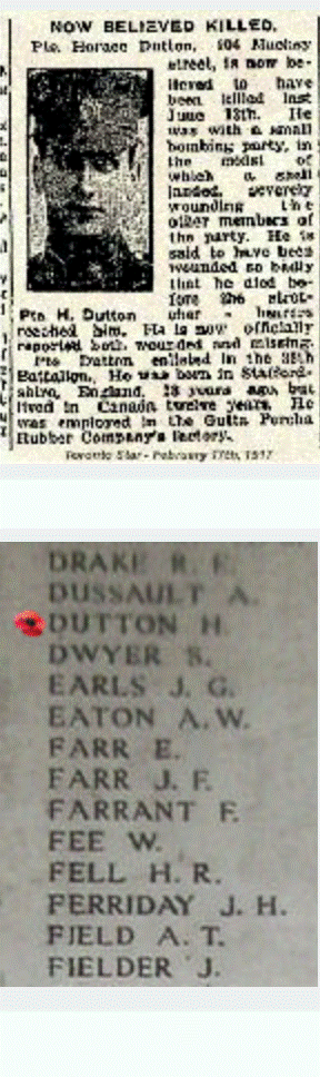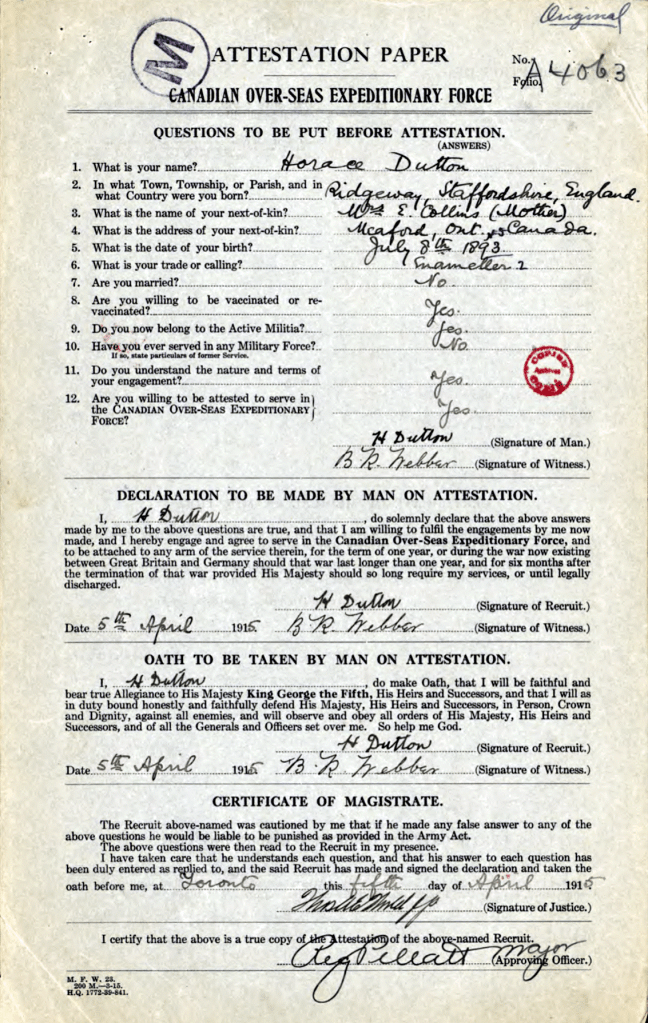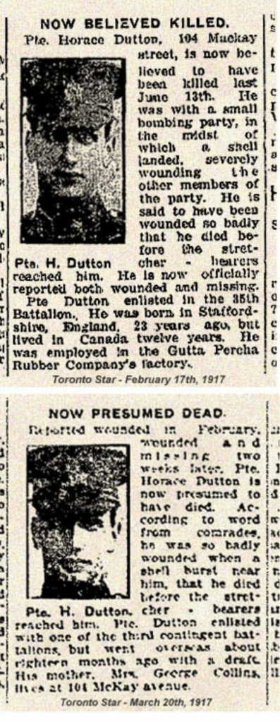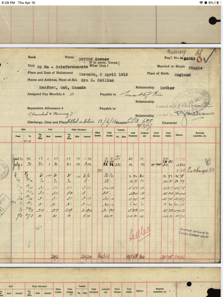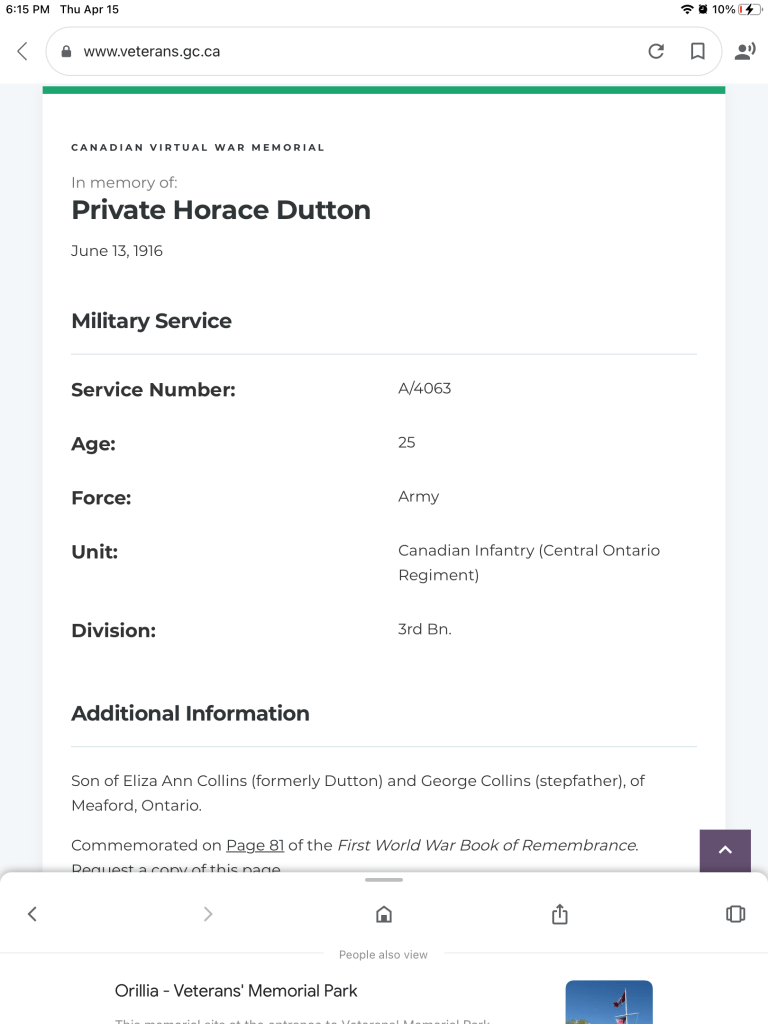 Horace Dutton was the brother of Mary Thomson (Dutton) “Auntie Mary” as we knew her. They were born in England and emigrated to Canada sometime in the early 20th century. They settled in Meadford, Ontario. On April 5, 1915, Horace enlisted in the Canadian Infantry, Ontario Regiment, 3rd Batallion. After a very short basic training, he was shipped off to France arriving at Boulogne on June 17th, 1915. He died on June 13, 1916. His body was never found.
