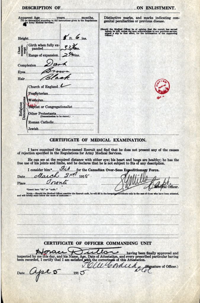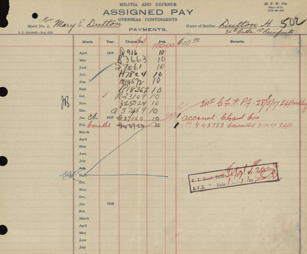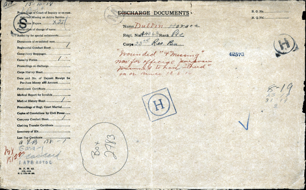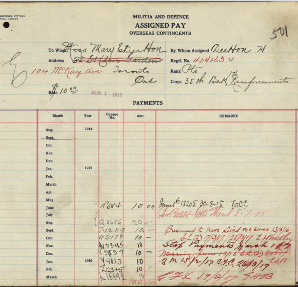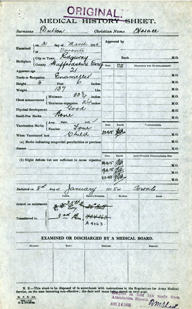 Horace Dutton was the brother of Mary Thomson (Dutton) “Auntie Mary” as we knew her. They were born in England and emigrated to Canada sometime in the early 20th century. They settled in Meadford, Ontario. On April 5, 1915, Horace enlisted in the Canadian Infantry, Ontario Regiment, 3rd Batallion. After a very short basic training, he was shipped off to France arriving at Boulogne on June 17th, 1915. He died on June 13, 1916. His body was never found.